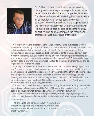 The principles and concepts in Why It Matter$ will guide you to explore new options and ideas for your future that will Awaken Your Financial Genius. Recession-proofing your life and your family with leveraged residual income streams is the new ‘genius’ way to financial stability – now and in the future. It is simply the best way for the average person to become financially self-reliant.