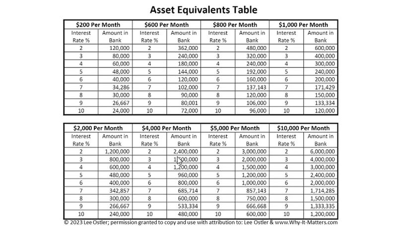 Use this chart to determine your monthly income from an amount of money in an investment or savings account, a well as to determine the 'asset equivalency' of a residual income stream occurring from a side-business.